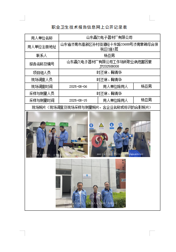 山東晶久電子器材廠有限公司工作場所職業(yè)病危害因素JP202508008